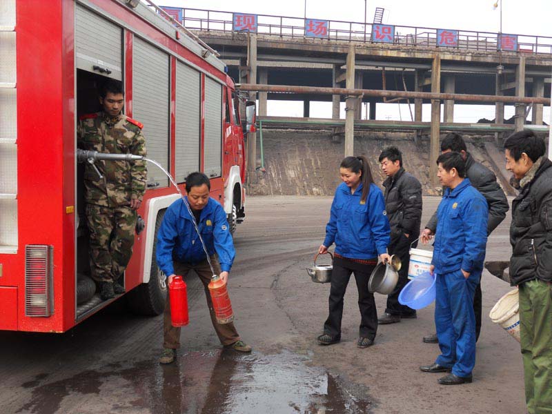 圖二:公司共建單位——郊區公安消防大隊用消防車,將生活用水送到該公司辦公樓、各車間及磷銨生活區。